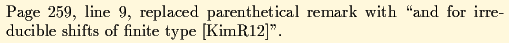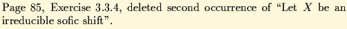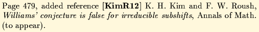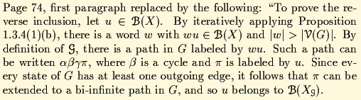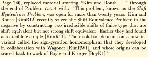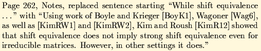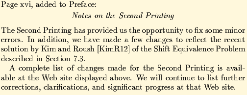 The Second Printing has given us the chance to correct a number of typographical errors, fix two proofs, add some clarifications, delete an incorrect part of an exercise, and highlight the solution by Kim and Roush of the Shift Equivalence Problem. The following is a complete list of all changes made in the Second Printing.